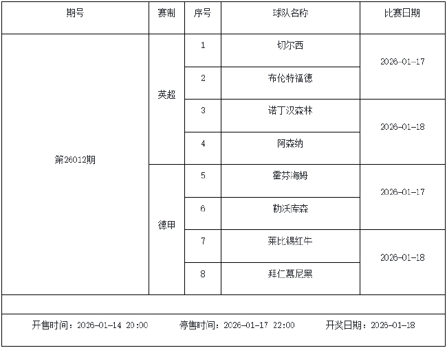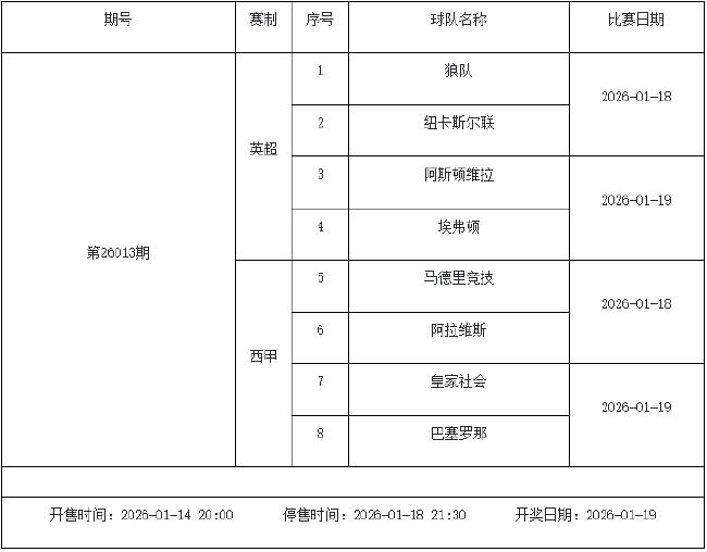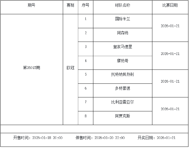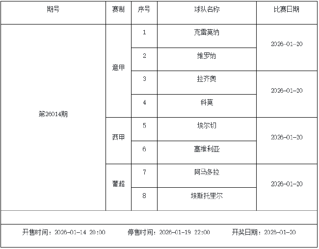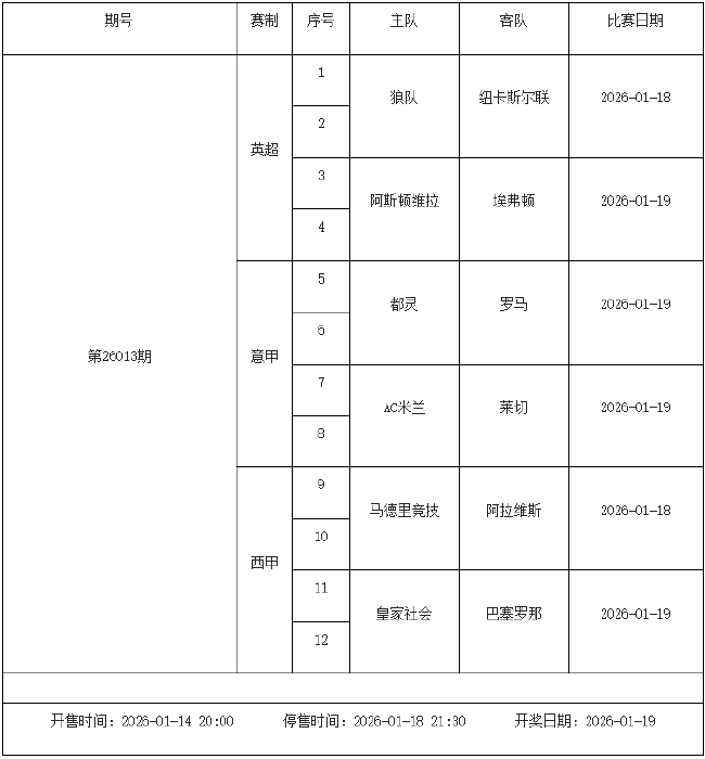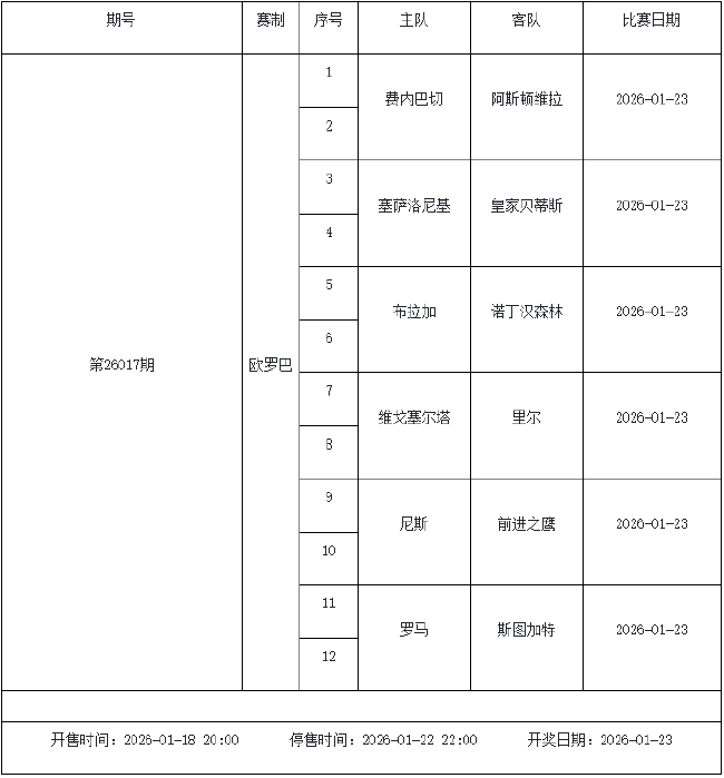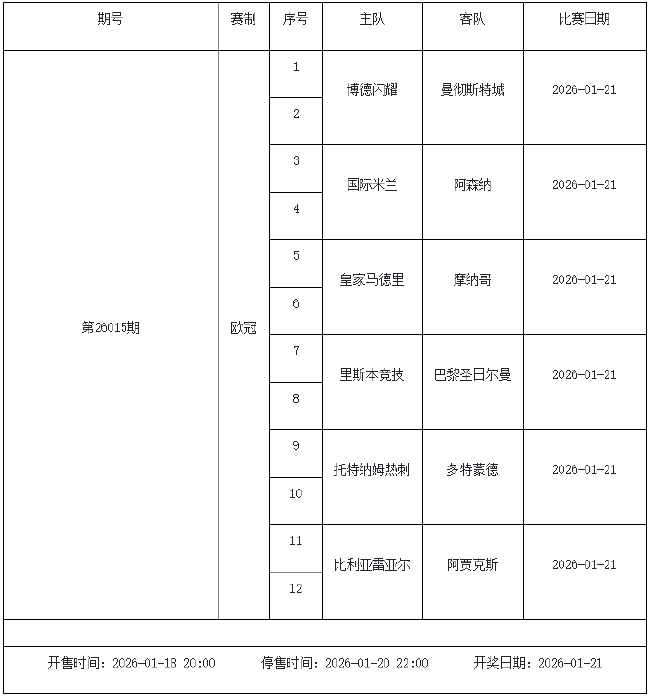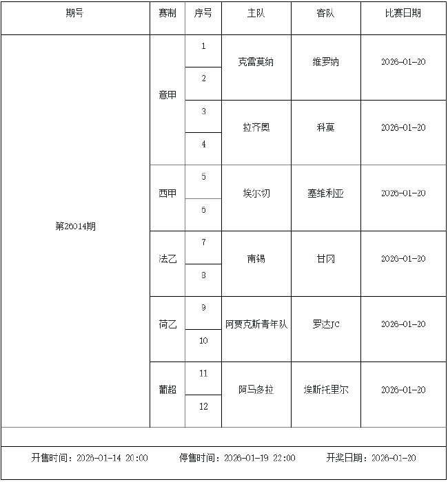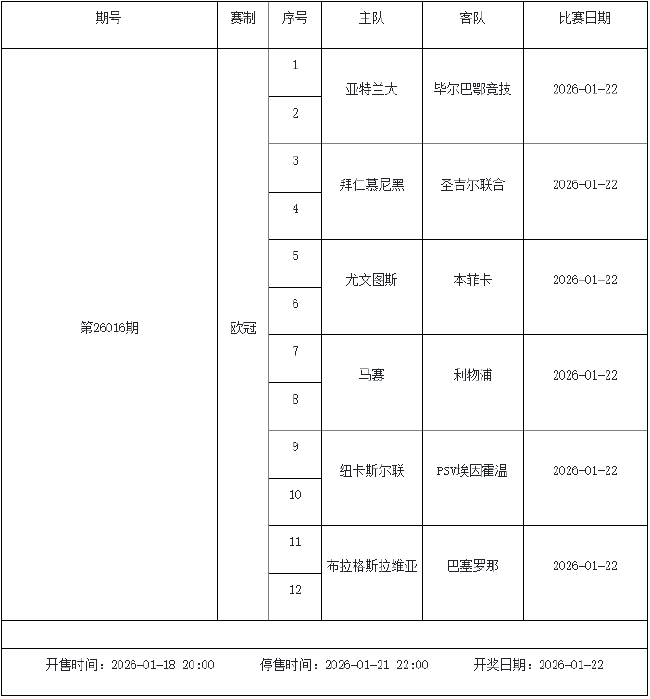 我中心制定了2026年中国足球彩票胜负游戏(14场、任选9场)、6场半全场胜负游戏和4场进球游戏1月16日-1月22日的竞猜场次安排(具体附后),其竞猜对象、开售时间、停售时间和计奖时间均以本文为准。