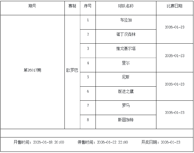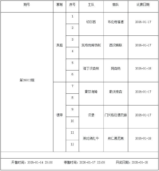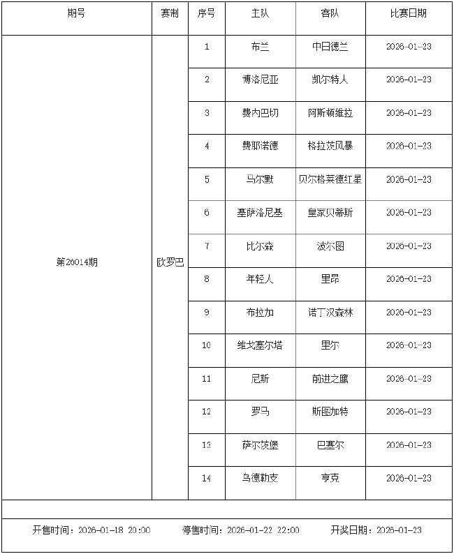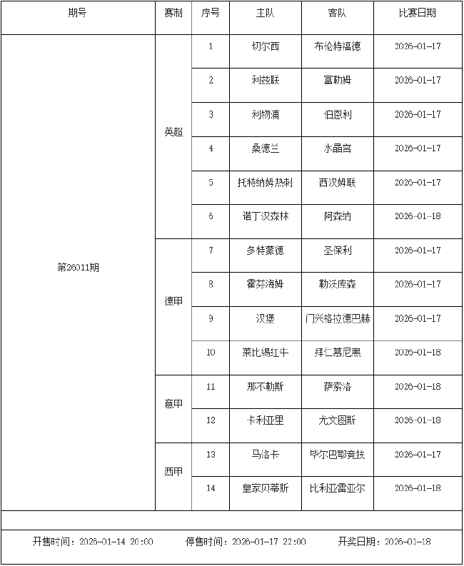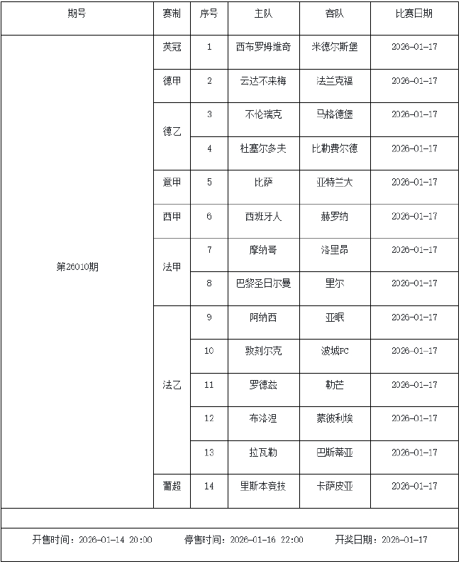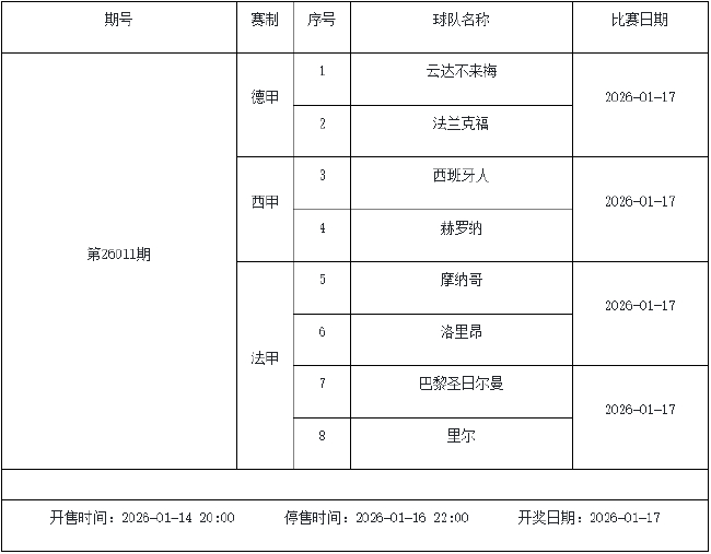 北京时间2026年1月13日,国家体彩中心公布了2026年1月16日-1月22日的足彩赛程,庄闲和游戏1月16日(周五)、1月17日(周六)、1月18日(周日)、1月20日(周二)、1月22日(周四)共5期。其中26010期竞猜英冠德甲德乙意甲西甲法甲法乙葡超赛事、第26011期由英超德甲意甲和西甲赛事组成、26012期由欧洲五大联赛组成、26013期全部为欧冠赛事、26014期为欧罗巴赛事。