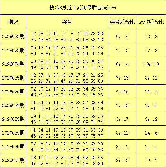 福彩快乐8第2026031期开出奖号:08 10 15 22 25 26 35 42 43 45 47 52 56 57 62 63 72 76 78 80,其中奖号质合比为2:18,奖号尾数质合比为13:7。