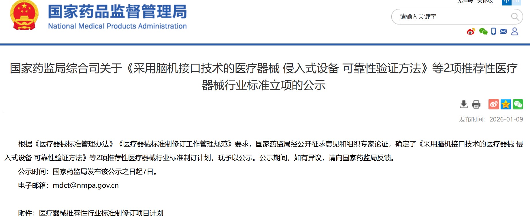 根据《医疗器械标准管理办法》《医疗器械标准制修订工作管理规范》要求,国家药监局经公开征求意见和组织专家论证,确定了《采用脑机接口技术的医疗器械侵入式设备可靠性验证方法》等2项推荐性医疗器械行业标准制订计划,现予以公示。公示期间,如有异议,请向国家药监局反馈。公示时间为国家药监局发布该公示之日起7日。
