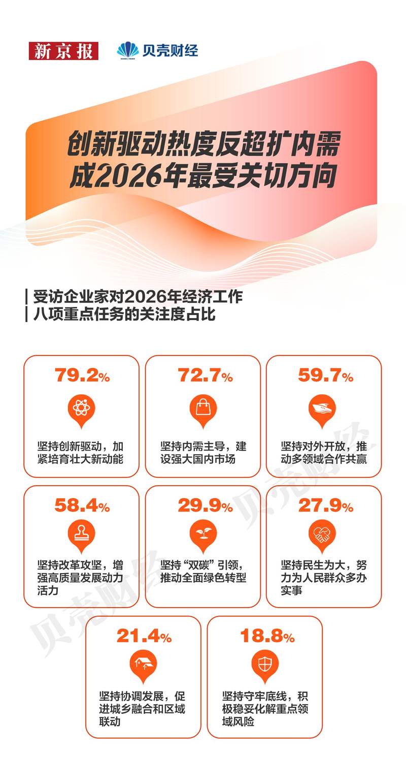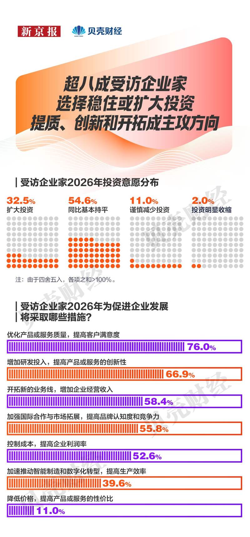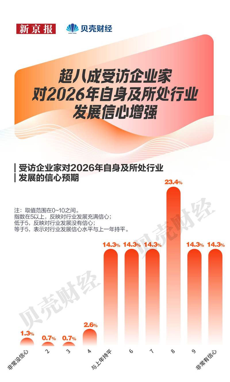 作为经济增长的“压舱石”与创新突破的“发动机”,企业的信心与战略选择,始终是观察中国经济趋势的风向标。2026年伊始,新京报贝壳财经再次面向19个行业的154位企业家展开问卷调研,系统梳理企业家对过去一年经营状况与发展环境的判断,以及对新一年趋势的展望。