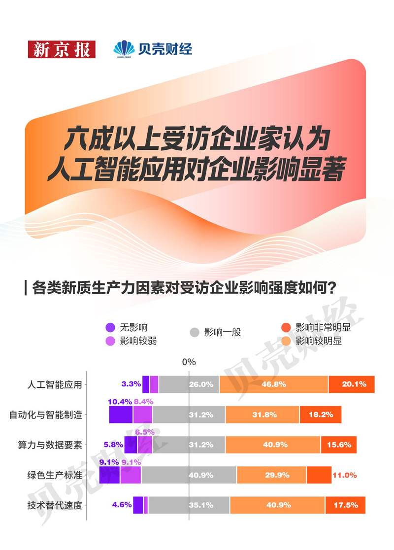调研显示,人工智能应用是受访企业家心中影响最显著的新质生产力因素,庄闲和游戏算力与数据要素、技术替代速度也是重要因素。以人工智能为核心的技术浪潮及其所需的基础设施,已经对企业产生了强烈而紧迫的变革压力,驱动其进行战略性响应。