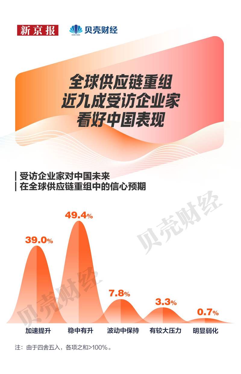 地缘政治紧张、部分产业转移、成本上升以及全球需求疲软等因素,对中国巩固和提升在全球供应链中的地位形成了现实阻力。不过,2025年,大多数受访企业对中国在全球供应链重组中的前景保持乐观,业界普遍看好中国供应链保持韧性并实现稳步升级。近九成的企业认为中国在全球供应链中的地位将“稳中有升”或“加速提升”。