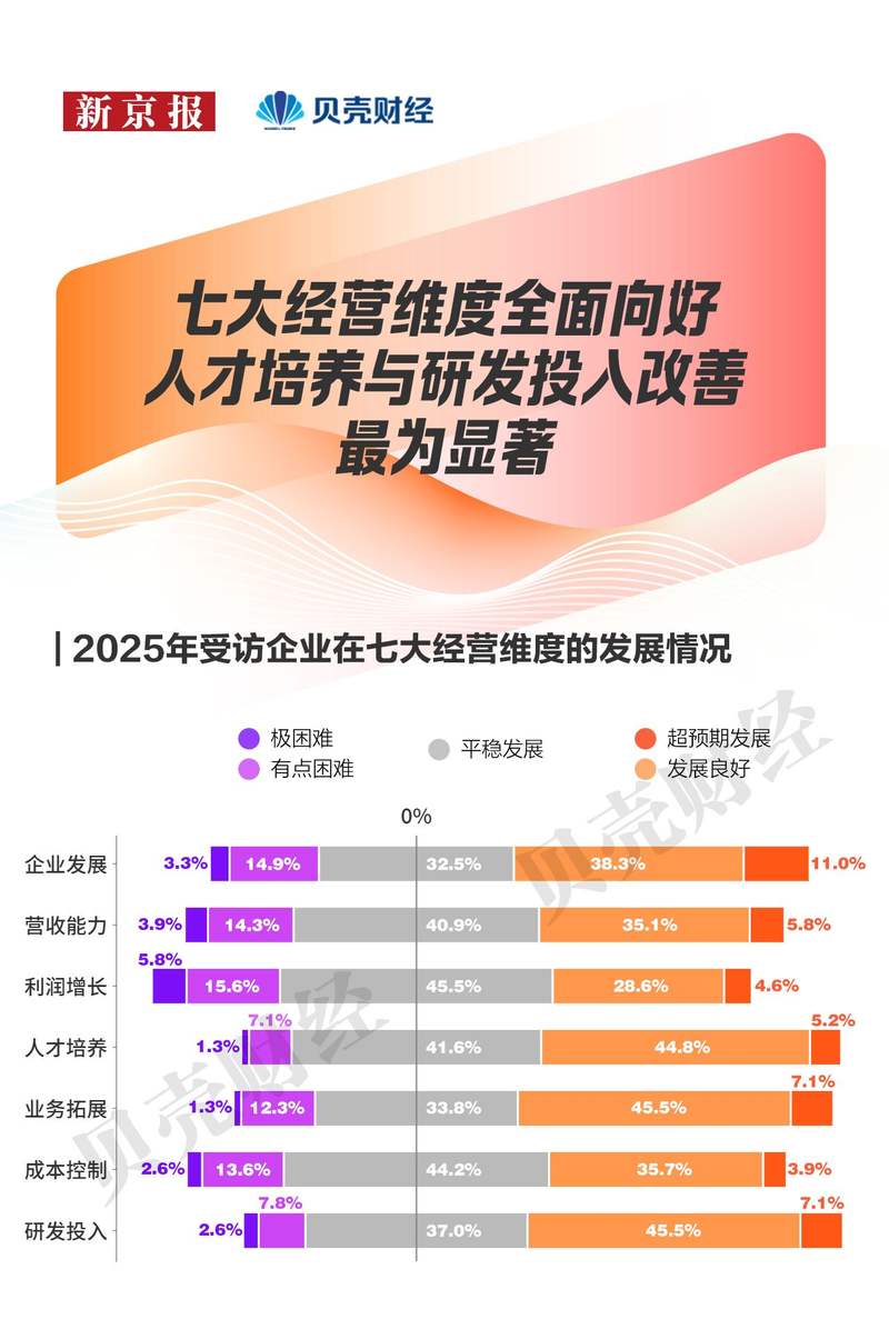 在七个经营维度上,受访企业的整体评价较上年均有所上升。其中,人才培养表现最为突出,研发投入、业务拓展方面的积极变化也较为显著。这类因素更依赖企业自身决策与执行力,主观可控性更强,也更容易转化为阶段性成果。