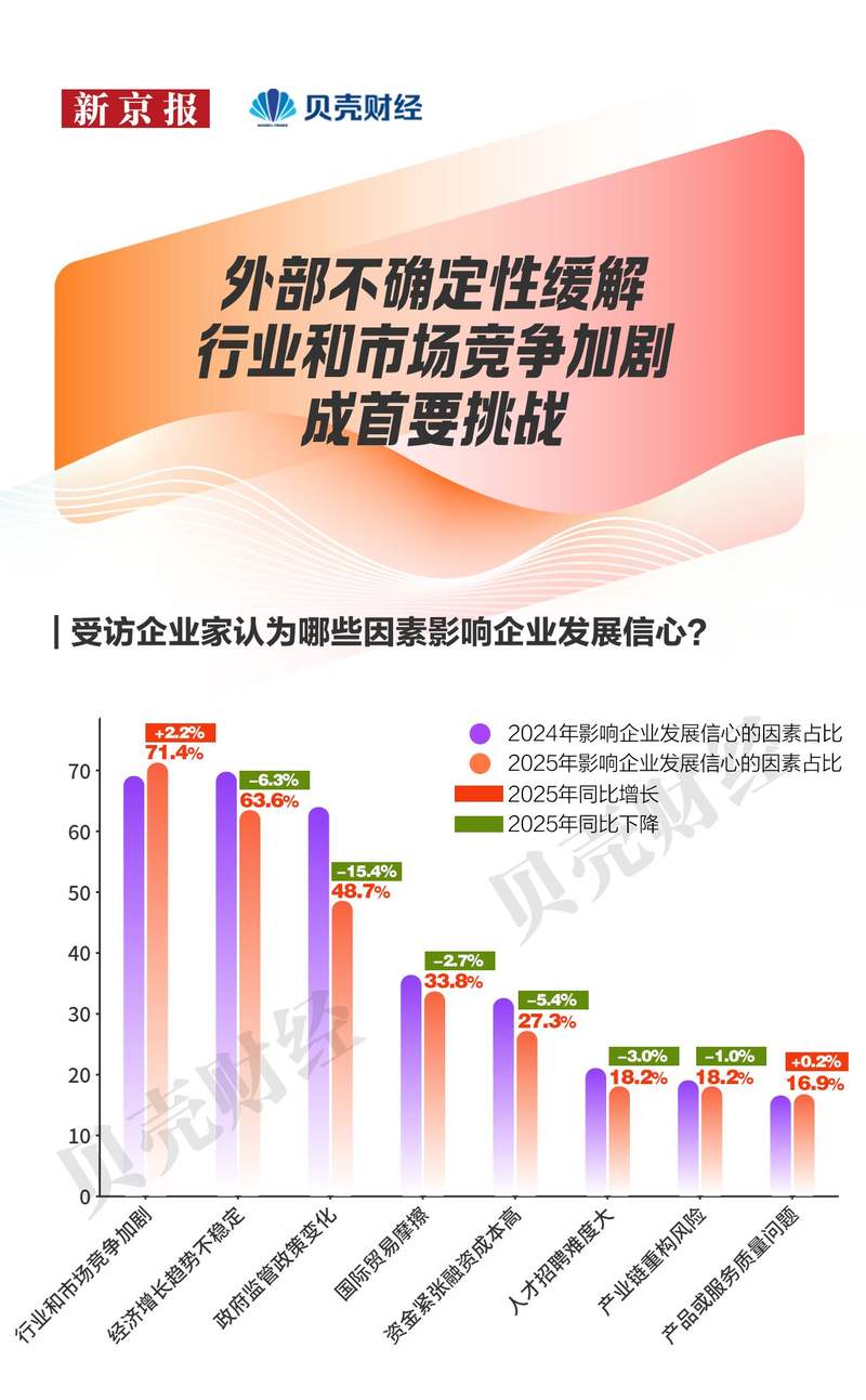 2025年,受访企业对外部不确定性的担忧整体缓解。除行业和市场竞争加剧外,其余主要影响因素的占比均较2024年有所下降。