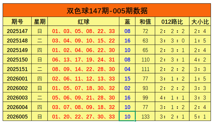 双色球第2026005开奖奖号:红球01、20、22、27、30、33,蓝球10。红球和值133,012路比3:2:1,大小比5:1。蓝球开出大数号码10。