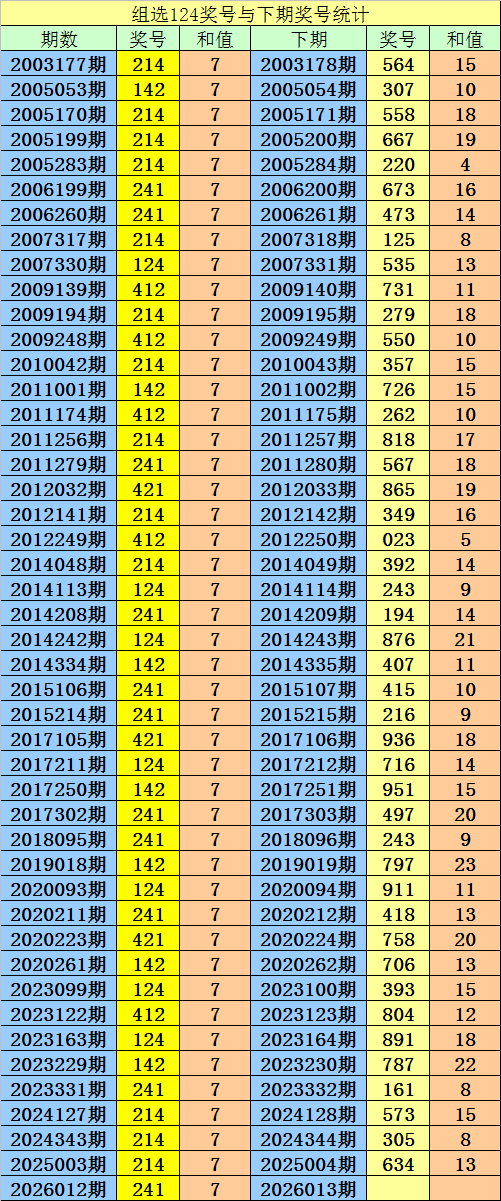 第2026012期3D奖号组选为:124,历史上该号码组选出现46次,下期号码分别为:564、307、558、667、220、673、473、125、535、731、279、550、357、726、262、818、567、865、349、023、392、243、194、876、407、415、216、936、716、951、497、243、797、911、418、758、706、393、804、891、787、161、573、305、634。