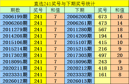 第2026012期3D奖号为:241,历史上该号码直选开出11次,下期号码分别为:673、473、567、194、415、216、497、243、418、161。