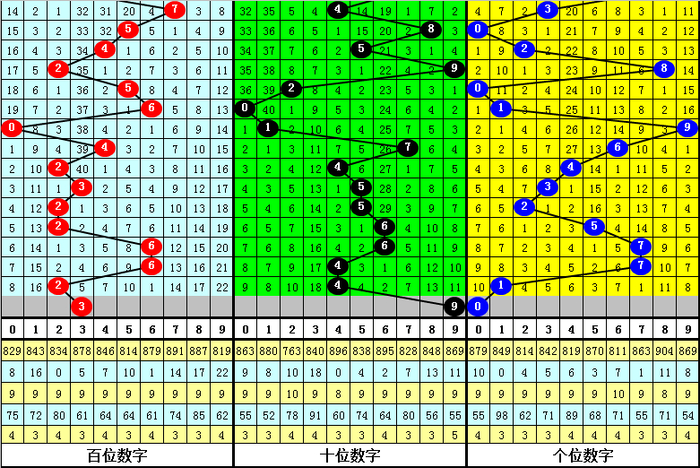 百个位合:前10期百个位两码合开出:7、9、0、6、6、4、7、3、3、3,其中百个位两码合012路比为7:3:0,奇偶比为6:4,本期看好百个位两码合开出0路号,参考两码合3、6、9。