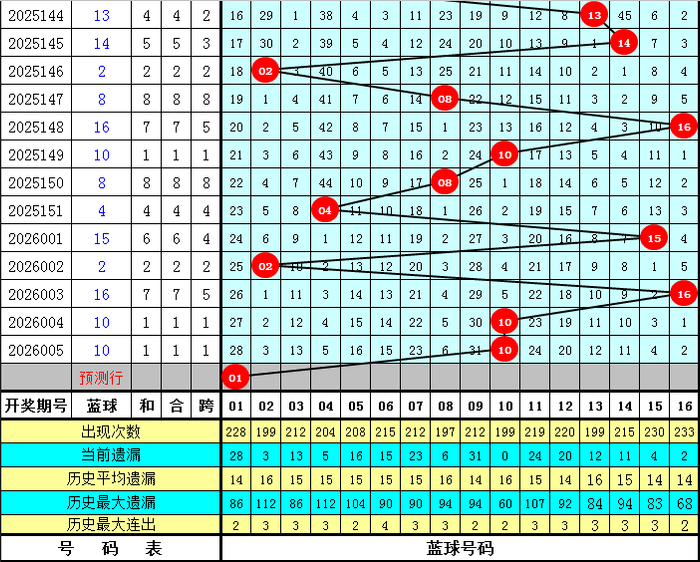龙头凤尾:上期龙头凤尾分别开出红球:01和33,跨度为32,最近10期红球跨度开出范围在19-32区段,上期跨度上升3个点位,本期防跨度逐渐下降,关注龙头凤尾组合:01和28。