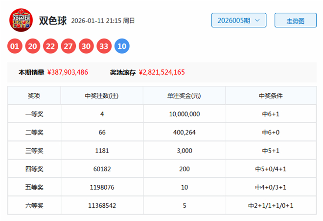 开奖回顾:双色球第2026005期奖号为:01 20 22 27 30 33 + 10,其中红球号码奇偶比为3:3,大小比为5:1,012路比为3:2:1,三区比为1:2:3。
