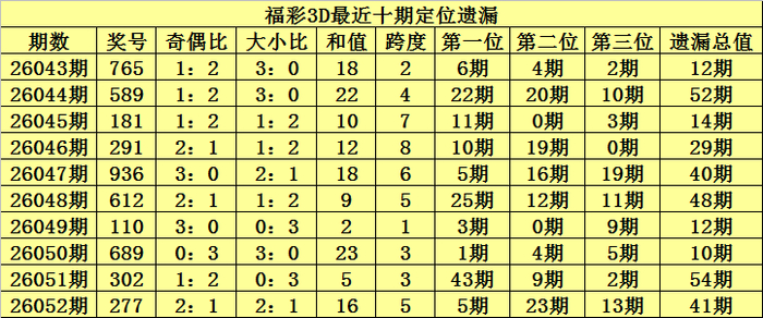 开奖纪念:福彩3D第2026052期奖号:277,百位号码遗漏5期、十位号码遗漏23期、个位号码遗漏13期,遗漏总值为41期。