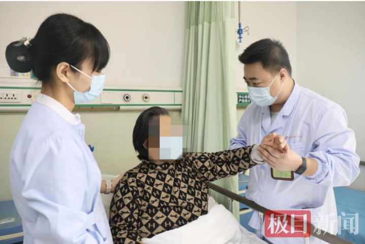 骨关节外科病房内,彭婆婆在康复师的指导下进行左肘功能锻炼通讯员代雨朦摄