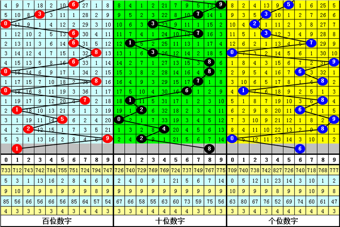 大中小分析:在组选0-9号码分布图中,前10期小 号(0-2区段)出现11枚奖号,中号(3-6区段)出现7枚奖号,大号(7-9区段)出现12枚奖号,上期中号区域没有落号,本期预计大中小区域各出1枚奖号。