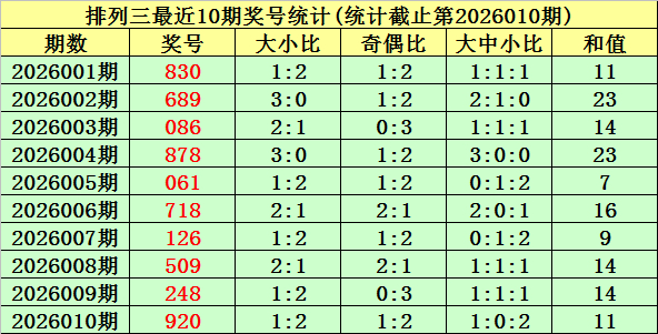 上期回顾:排列三第2026010期奖号为:920。奖号类型:组六,和值:11,奇偶比:1:2,跨度:9,大小比:1:2。