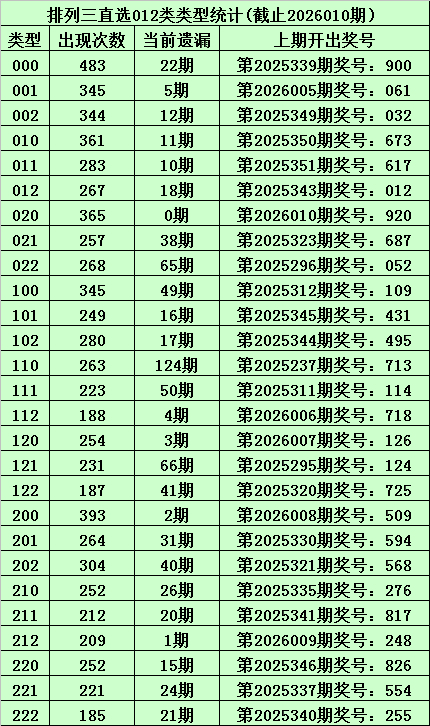 上期回顾:体彩排列三第2026010期开出奖号:920,其012路比为2:0:1,奖号012路类型为:020。
