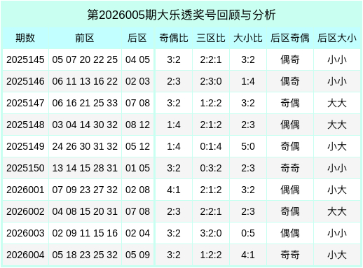 大乐透第26004期开出奖号:05、18、23、25、32 + 05、09。其中前区号码三区比为1:2:2,奇偶比为3:2,大小比为4:1,后区开出奇数+奇数、小数+大数。